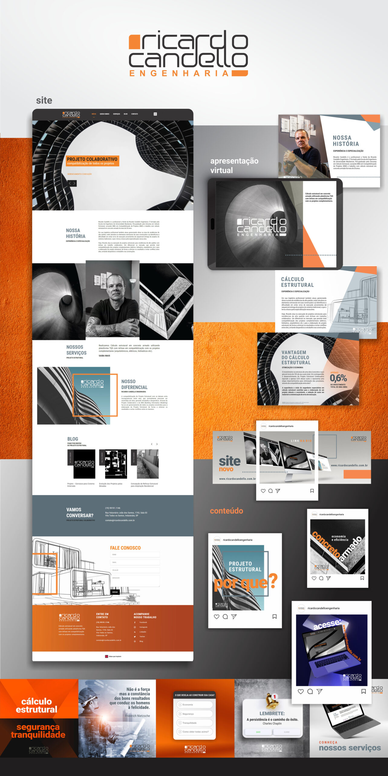 A identidade visual foi desenvolvida para refletir solidez e equilíbrio, transmitindo o rigor técnico e o olhar minucioso que caracterizam cada projeto assinado pelo escritório. Mas não paramos na marca. Assinamos também o novo site da Ricardo Candello Engenharia, um projeto moderno, responsivo e com navegação intuitiva, projetado para destacar portfólio, credibilidade e expertise técnica.